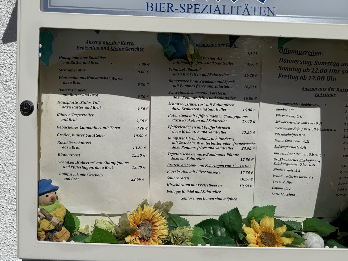 The menu at Gasthaus 'zum Stillen Tal' presents a well-balanced selection of traditional German fare with a comforting, homemade feel. The Bauernsteak stands out as a hearty highlight, perfectly seasoned and paired with sides that enhance its rustic appeal. For those seeking tender pork, the Schweinelendchen offers a succulent option that showcases careful preparation and rich flavor. Vegetarians are not overlooked, with dishes like Schupfnudeln Mit Gemüse providing a satisfying combination of soft, pillowy noodles and fresh seasonal vegetables. Meat lovers will appreciate the robust taste of the Pariser Pfeffersteak, a dish marked by its bold peppercorn seasoning and expertly cooked texture. To round off the meal, the dessert menu features treats like Gemischtes Eis Mit Sahne, a simple yet indulgent choice that perfectly complements the hearty main courses. Overall, the menu demonstrates a thoughtful mix of classic German cuisine and comforting flavors, with each dish prepared to highlight its key ingredients while maintaining an inviting, homestyle character.